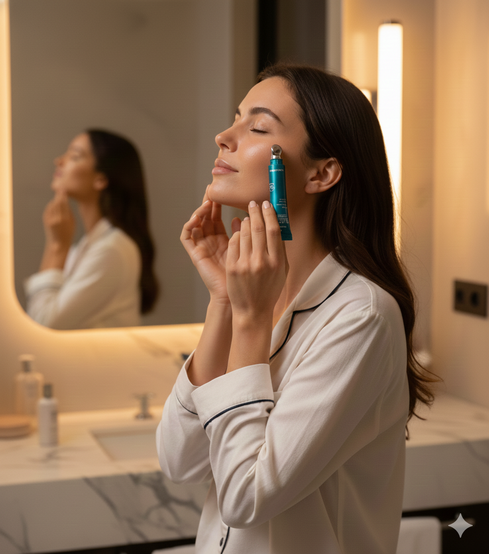 - Spread over clean, dry skin using the metal tip to the eye and lip contour areas